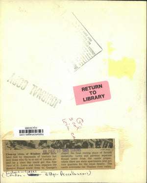 England, cities, London, buildings, miscellaneous. Close-up views of Windsor castle have been had by thousands of tourists but only those who fly in or out of London airport on a clear day could get this fine view of it. Lawn and trees separate the massive Round tower from St. George's chapel, the final resting place of British monarchs. Lawn and gardens separate Round tower from the castle proper, where there are state apartments and private quarters for the royal family. The castle overlooks the Thames river valley.