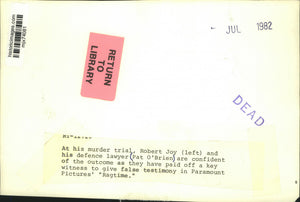 At his murder trial, Robert Joy (left) and his defense lawyer Pat O'Brien are confident of the outcome as they have paid off a key witness to give false testimony in Paramount Pictures' "Ragtime."