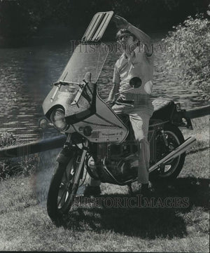 JOHN S. HICKMAN adjusts the part of the Hickman Rain Handler that steers rain and wind around a motorcyclist who runs into a shower. The Shorewood manE™s invention also includes a windshield made of material hard enough so a windshield wiper can be used without scratching it. The Rain Handler is available from area cycle dealers for about $220, Hickman said. It is fitted to a Windjammer motorcycle shield, which retails for about $225, and, Hickman says, turns a motorcycle from a fair weather machine into an all weather vehicle. Hickman on bike.