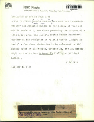Angela Lansbury as Gertrude Vanderbilt Whitney and Jennifer Dundas as her niece, 10-year-old Gloria Vanderbilt, are shown pondering the outcome of a 1934 trial after the child's mother sought permanent custody of the youngster in "Little Gloria...Happy at Last," a four-hour miniseries to be colorcast on NBC Sunday Night at the Movies October 24 & October 25, 9-11 p.m. NYT both nights.