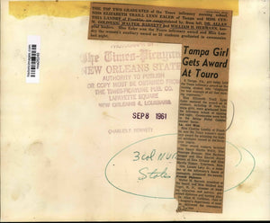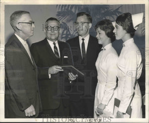 The top two graduates of the Touro Infirmary nursing school, Miss Elizabeth Thraill Lynn Ealer of Tampa and Miss Cynthia Landry of Franklin, are congratulated by, from left, Dr. Allan M. Goldman, Walter Barnett and William H. Hermann, hospital leaders. Miss Ealer won the Touro infirmary award and Miss Landry the women's auxiliary award as 21 students graduated in ceremonies last night.