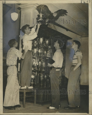 High point scorers for Warren Eastern High school in the Times-Picayune Biggest News of the Week contest add the trophy they helped win to their school's collection. They are (from left) Bob Weaver, Bill Eggerton, Edward de Martini and Jimmie Boisseau.