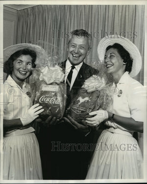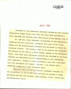 Governor Floyd Collins of Florida, permanent chairman of the Democratic National Convention, is one of the first arrivals to receive a caddy, presented here by Jean Boorman, Santa Barbara, California, Naida Katz, San Bernadino, California. Delegates to the Democratic National Convention will receive hospitality caddys filled with wine and fruit from California's rich vineyards and orchards when they arrive in Los Angeles July 11. Mr. and Mrs. Harry Blackman, co-chairmen of the hospitality committee for the convention, announced that each of the 4,506 caddys will be professionally packaged and delivered to hotels by volunteer drivers. The coolers, made of red plastic are insulated and painted on one side is a white donkey, emblem of the Democratic Party. More than nine California products are included in the kits. Contents and containers are all complimentary to the convention host committee. Wrapped in gold cellophane, tied with a big gold bow, the containers are tagged, "Welcome - Los Angeles Host Committee wishes you a most enjoyable stay."