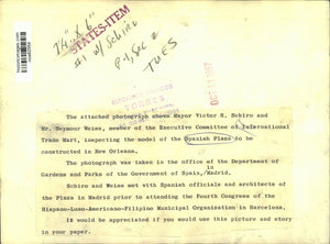 The attached photograph shows Mayor Victor H. Schiro and Mr. Seymour Weiss, member of the Executive Committee of International Trade Mart, inspecting the model of the Spanish Plaza to be constructed in New Orleans. The photograph was taken in the office of the Department of Gardens and Parks of the Government in Spain, Madrid.