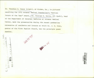 Dr. Theodore A. Moore (right), of Minden, La., is pictured receiving the 1972 Ochsner Medical Foundation's Medical Intern of the Year award. Dr. William D. Davis, Jr., (left), Head of the Department of Internal Medicine at Ochsner Medical Center, made the presentation during the recent graduation ceremonies.