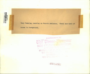 Dary Demning, working on Nutria skeleton. Heron and head of horse in foreground.