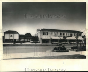 Front View of the new St. Charles Avenue office of First National Bank of Commerce shows the overhead enclosed brigade which is a working area for tellers. Motorists who enter the drive-up area at left have their transactions speeded by pneumatic tubes. The grand opening of the new St. Charles office of the First National Bank of Commerce will be at 9 a.m. Tuesday.