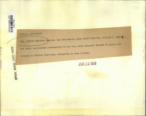 Mrs. Bessie Ferguson receives the Navy-Marine Corps Medal from Col. William L. Beach. The medal was awarded posthumously to her son, Lance Corporal Patrick Sinclair, who drowned in Vietnam last year, attempting to save a buddy.