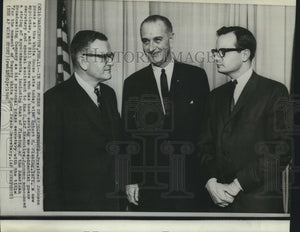 Washington -- In The Press of Appointments -- President Johnson poses at the White house late today with Robert H. Fleming, left, a new appointee, and Bill Moyers who has been serving serving as presidential press secretary and special assistant to the Chief Executive. Johnson announced a string of appointments, including that of Fleming of the American Broadcasting Company as his personal press secretary with the title "for the moment" of Deputy White Press Secretary.