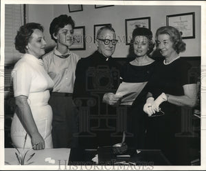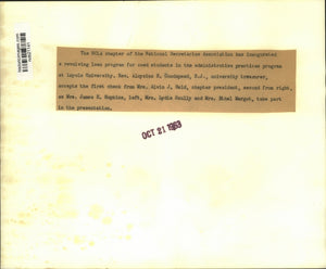The NOLA chapter of the National Secretaries Association has inaugurated a revolving loan program for coed students in the administrative practices program at Loyola University. Reverend Aloysius B. Goodspeed, S.J., university treasurer, accepts the first check from Mrs. Alvin J. Held, chapter president, second from right, as Mrs. James E. Hopkins, left, Mrs. Lydia Scully and Mrs. Ethel Margot, take part in the presentation.