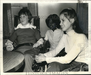Kathie Giddings of Shreveport (left) has spent almost 11 months in New Orleans, but they were not the happiest of her life. She underwent physical therapy at the Louisiana State University School of Medicine after an automobile accident left her paralyzed from the neck down. She left for home Saturday to get married. Mrs. Rose Jones, one of her nurses (center), and Cathy Ducote, her vocational rehabilitation counselor, helped make her stay more pleasant. Kathie Giddings used to race sports cars, play the violin for the Northwest State College Symphony in Natchitoches and study at the college before an automobile accident in Arkansas 11 months ago left her a quadriplegic.