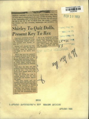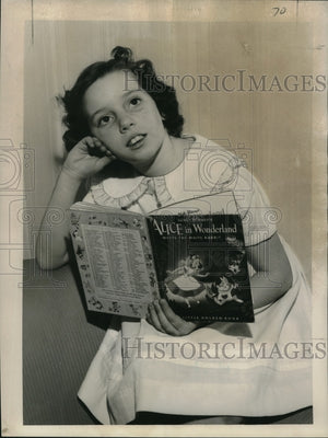 Shirley Gouner, 9, of the Protestant Orphan Home, takes time out from Alice in Wonderland to do some real-life dreaming. Shirley is the "outstanding child" at the home and therefore she will present the key to the city to Rex on Mardi Gras. She weighs 72 pounds, has freckles and likes dreaming, hamburgers and strawberry ice cream.