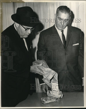 1967 Press Photo Captain Henry Monis of NOPD & Joseph D. Giarrusso-bag of cash