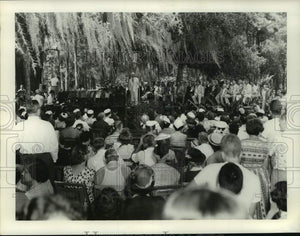 1956 Press Photo James T. Burns address crowd under oaks at Fontainebleau