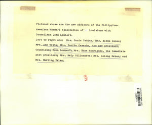 Pictured above are the new officers of the Philippine-American Women's Association of Louisiana with Councilman John Lambert. Left to right are: Mrs. Sonia Tablan; Mrs. Elena Lucas; Mrs. Ann Ureta; Mrs. Fenita Camacho, the new president; Councilman John Lambert; Mrs. Edna Rodriguez, the immediate past president; Mrs. Mely Villanueva; Mrs. Loleng Habon; and Mrs. Marling Valen.