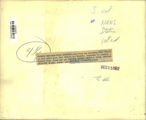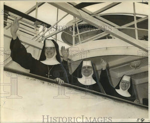 Three benedictine sisters wave from the steamship Thor Odland as they sailed from New Orleans for Medellin, Columbia, to establish a mission there. From left are Sister Maris Stella, O.S.B.; Sister Jeanne D'Arc, O.S.B.; and Mother Patricia, O.S.B.