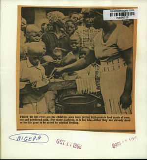 Nigeria - First to be fed are the children, seen here getting high-protein food made of corn, soy and powdered milk. For many Biafrans, it is too late, either they are already dead or too far gone to be saved by normal feeding.