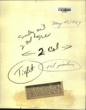 Designed for high pressure installations, this elastomeric plug valve is shown in use near a high-pressure refinery storage tank. It is used to open and close liquified petroleum gas lines, and is so constructed that it seals itself tighter as pressure increases, cutting down valve loss which has been prevalent in the industry for many years. Oil pipeline