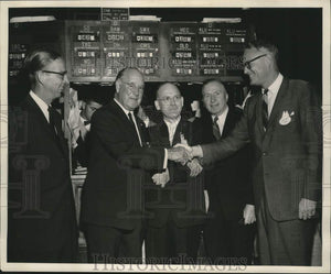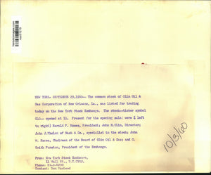 Olin Oil stock holders at New York Stock Exchange. The common stock of Olin Oil and Gas Corporation of New Orleans, Louisiana, was listed for trading today on the New York Stock Exchange. The stock-ticker symbol OLO - opened at 16. Present for the opening sales were (left to right) Harold F. Moses, president; John M. Olin, Director; John J. Pelan of Nash and Company, specialist in the stock; John W. Hanes, Chairman of the Board of Olin Oil and Gas; and G. Keith Funston, President of the Exchange. New York Stock Exchange, Wall Street.
