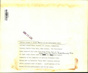 Captain George F. Price and Major General A.L. Bowser. Captain George F. Price, Master of the Christopher Lykes welcomes aboard Major General A.L. Bowser, Commanding General, Marine Corps Base, Camp Lejeune. The Christopher Lykes departed this week from Sunny Point, North Carolina as one of eight cargo liners owned by Lykes Bros. S/S ...Delta Steamship and other member companies of the Committee of American Steamship Lines taking part in Operation "Steel Pike" invasion exercise off the southern coast of Spain. 33,000 marines of the Second Division participated with 80 war ships.