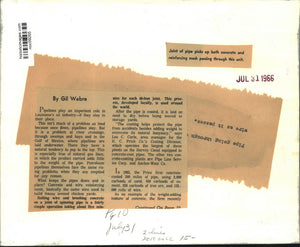 Pipeline Production on Harvey Canal, New Orleans. Pipelines play an important role in Louisiana's oil industry -- if they stay in their place. This isn't much of a problem on land because once down, pipelines stay. But it is a problem at river crossings, through swamps and bays and in the Gulf of Mexico, where pipelines are laid underwater. There they have a natural tendency to pop to the top. This is especially true of natural gas lines, in which the product carried adds little to the weight of the pipe. Petroleum pipelines themselves face the same rising problems when they are emptied for any reason. Joint of pipe picks up both concrete and reinforcing mesh passing through this unit.