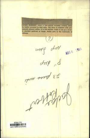 University of Alabama - Jackie Robbert in Evening Dress. Jackie Robbert wears a full-skirted lavender evening dress, the bodice accented in blue satin. The dress is trimmed with permanently-pleated ruffles. It is full-skirted. Under it can go a favorite starched petticoat or hoops. Jackie goes to the University of Alabama.