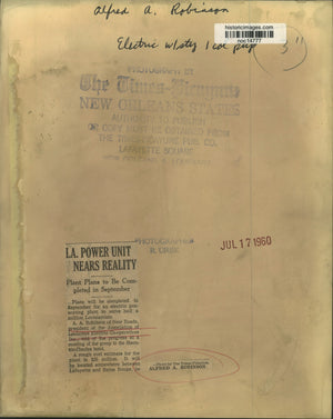 Alfred A. Robinson. Plans will be completed in September for an electric generating plant to serve half a million Louisianians. A. A. Robinson of New Roads, president of the Association of Louisiana Electric co-operatives Incorporated told of the progress at a meeting of the group in the Sheraton-Charles hotel. Louisiana.