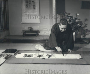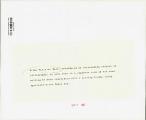 Prime Minister Sato, considered an outstanding student of calligraphy, is seen here in a Japanese room of his house writing Chinese characters with a writing brush, using specially-mixed India ink.