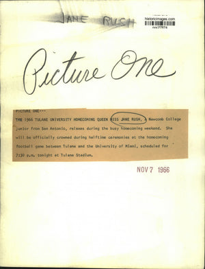 The 1966 Tulane University Homecoming Queen Miss Jane Rush, a Newcomb College junior from San Antonio, relaxes during the busy homecoming weekend. She will be officially crowned during halftime ceremonies at the homecoming football game between Tulane and the University of Miami, scheduled for 7:30 pm. Tonight at Tulane Stadium.