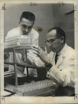 1959 Press Photo Scientist Dr. Jonas Salk and associate work in laboratory.