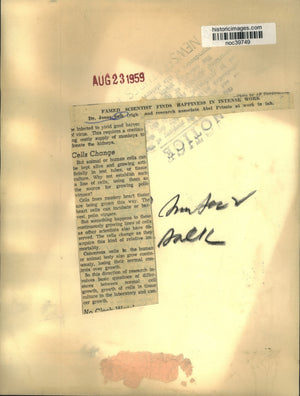 Dr. Jonas Salk (right) and research associate Abel Prinzle at work in lab. infected to yield good harvest of virus. This requires a continuous costly supply of monkeys to donate the kidneys. But animal and human cells can be kept alive and growing artificially in test tubes, or tissue culture. Why not establish such a line of cells, using them as the source for growing polio viruses?