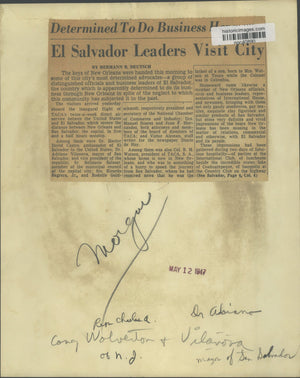 Charles Wolverton and Adriano Vilanova in New Orleans Ceremony. The keys of New Orleans were handed this morning to some of this city's most determined advocates - a group of distinguished officials and business leaders of El Salvador, the country which is apparently determined to do its business through New Orleans in spite of the neglect to which this community has subjected it in the past. The visitors arrived yesterday aboard the inaugural flight of TACA's twice-a-week direct air service between the United States and El Salvador, which covers the distance between New Orleans and San Salvador, the capital, in five and half hours nonstop. Representative Charles A. Wolverton, Dr. Adriano Vilanova, mayor of El Salvador.