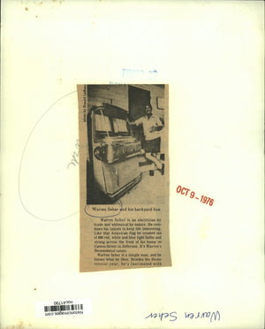 Warren Seher and Antique Jukebox. Warren Seher and his backyard box. Warren Seher is an electrician by trade and whimsical by nature. He combines his talents to keep life interesting. Like that American flag he created out of 800 red, white and blue light bulbs and strung across the front of his house on Canton Street in Jefferson. It's Warren's Bicentennial salute. Warren Seher is a simple man, and he knows what he likes. Besides the Bicentennial year, he's fascinated with...