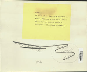 In front of St. Patrick's hospital in Kumasi, Williams greets tribal chief. Ambassador had come to donate a refrigerated blood bank to hospital.