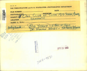 Owl Club of Tulane University - Rod Yeager and Dr. Norman Woody. Owl Club of Tulane Medical School Awards. Rod Yeager, vice president of Owls; Dr. Norman Woody, top award winner.