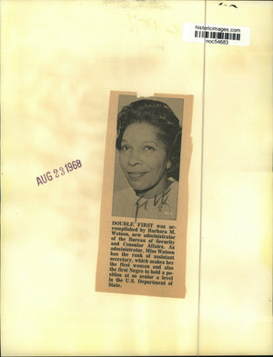 Double first was accomplished by Barbara M. Watson, new administrator of the Bureau of Security and Consular Affairs. As administrator, Miss Watson has the rank of assistant secretary, which makes her the first woman and also the first African-American to hold a position at so senior a level in the United States Department of State.