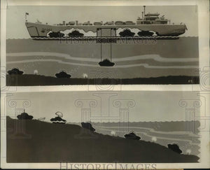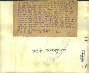 Mechanix Illustrated Magazine Illustration of Amphibious Tank. The above illustration from Mechanix Illustrated Magazine shows how the newly-designed undersea tank would make an effective landing on enemy soil. Still in the blueprint stage, the underwater tank designed for amphibious landings offers a solution to the many problems in spearhead operations. This modern technical apparatus would give added protection against heavy shore installations by travelling below the sea and also by being heavily armored. The clear plexiglas which covers rotating turret while under water is blown off for action when the tank is landed.