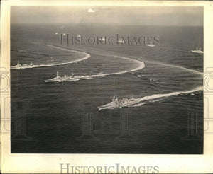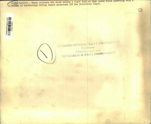 Heavy cruisers are shown making a right turn at high speed while operating with a column of battleships during recent maneuvers off the California Coast.