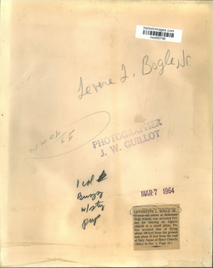 Crimes - Leverette L. Bogle Jr., 17-year old senior at Behrman High School, was arrested Friday for buzzing an Algiers church in a small plane. Police accused him of flying about 100 feet from the ground and about 15 feet from the roof of Holy Name of Mary Church. (Story in Section 1, Page 14).