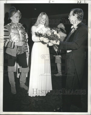 Rene Robert Cavalier, Sieur de la Salle (who's really Doctor David W. Aiken) approves of the flowers Julian Sherrouse Jr. presents to Francoise Billion Richardson for her presentation at the Pendennis Club's bal masque.