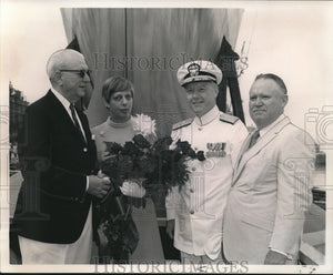 Preparing for the launch of the destroyer escort Blakely at Avondale Shipyards are, from left, United States Representative F. Edward Hebert, principal speaker; Mrs. Robert J. Morgan, sponsor; Rear Admiral R. E. Adamson Junior, USN, Deputy Commander, Fleet Maintenance and Logistic Support, Naval Ship Systems Command; and Henry Zac Carter, president and chairman of the board of Avondale Shipyards.