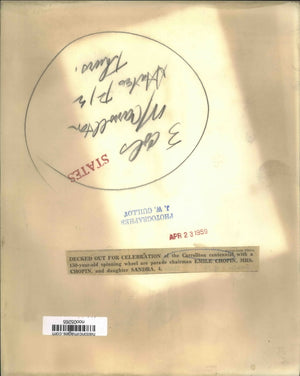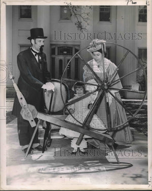 Decked out for celebration of the Carrollton centennial with a 150-year-old spinning wheel are parade chairman Emile Chopin, Mrs. Chopin, and daughter Sandra, 4.