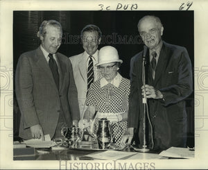 Henry B. Curtis (right), former city councilman, is honored in the City Council chamber at City Hall Thursday for his more than 40 years of service to the city government. A silver service set was presented to the former councilman and Mrs. Curtis. Present for the ceremony were Mayor Moon Landrieu (left) and City Councilman Peter Beer.