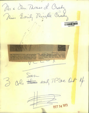 New Orleans Socialites - The President's Ball and presentation of daughters given by members of the Bienville Club was a recent interesting event and took place at the New Orleans Country Club. Mr. and Mrs. Thomas T. Crosby are pictured at the party with their daughter, Miss Emily Minette Crosby, who was among the young honorees.