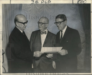 M. L. Dresner, left, Herman L. Barnett, center, and Eward Haspel, right were two of the oldest notaries honored Friday at a luncheon meeting of the Notaries Association of New Orleans. M. L. Dresner (left), president of the association, congratulates the pair who became members of the association in 1914. The luncheon honored those with 50-year memberships and over 50.