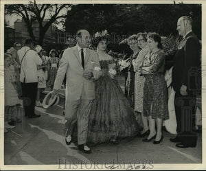 Miss Mel Boyer, a member of the Krewe of Adonis, is escorted by Mayor Victor H. Schiro at an Easter hat contest in Jackson square yesterday.