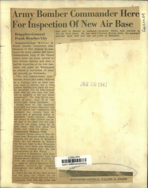 Brigadier-General Walter H. Frank, recently transferred from Honolulu to New Orleans to command the newly created 21st heavy bombardment wing of the United States Army Air Corps, arrived in New Orleans Sunday and after a hurried inspection of his new command, left today for Washington to attend a conference of army air generals on Wednesday. "The 21st bombardment wing," General Frank said today, "will not be a training unit as some persons seem to believe, but a well-trained fighting unit ready for war. Its personnel will be fully-trained when they are sent here and they will be assigned to the very latest equipment." The wing will be composed of more than 40 of the Army's new flying fortresses.