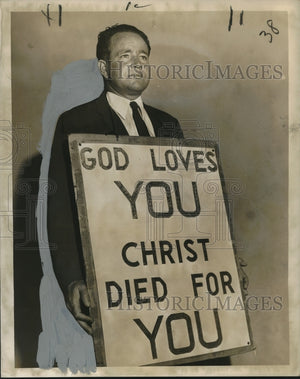 1958 Press Photo Reverend Samuel Fife holding a sandwich board "God Loves You"