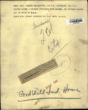 Goodwill Industries Home. Unloading a National Guard truck bringing used clothing and household articles to the Goodwill Industries Home Sunday are T/Sgt. Vincent Walgamotte, Boy Scouts Lionel Dubuison, Leonard Dubuisson, John Martin and Richard Harris, and S/Sgt. Stuart Johnson. The Guardsman are members of the 141st Field Artillery Battalion and the Scouts belong to Troop 95. Technical Sgt. Vincent Wilgamontte, 141 F.A. Battalion La. N.G. Scouts Lionel & Leonard Dubuisson, John Martan, and Richard Harris all of Troop 95 B.S.A. Staff Sgt. Stuart Johnson 141 F.A. Battery La. N.G.
