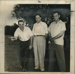 Radio-TV Assn. Holds Annual Golf Tourney, Outing. No Golf For Them. But (left to right) Al Labiche, general chairman, and Lloyd Bourgeois and Fred Gerstner, co-chairmen, tried some horseshoe pitching. There was swimming, too, as the association went